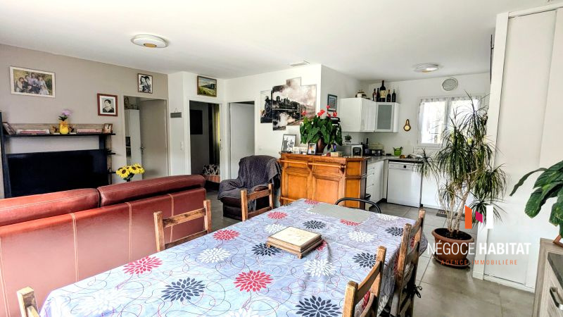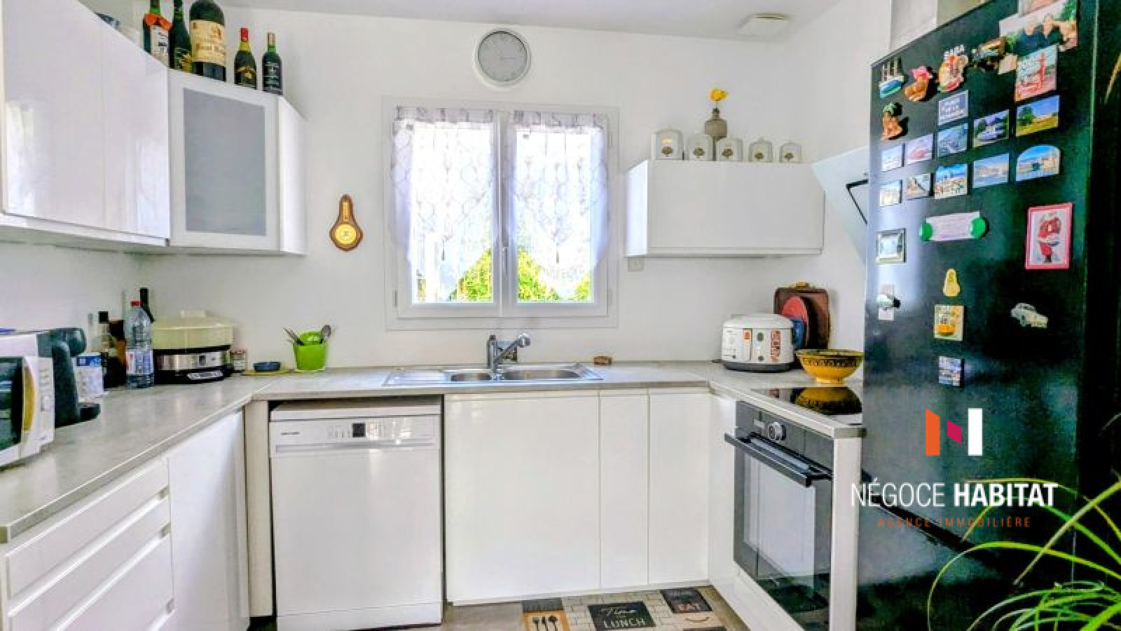 La cuisine ouverte s’intègre harmonieusement à la pièce de vie, baignée de lumière grâce à une baie vitrée donnant sur la terrasse.