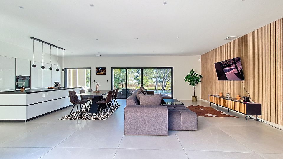 La pièce de vie de 63 m² offre un espace salon / salle à manger ouvert sur une cuisine entièrement équipée, avec de larges ouvertures donnant accès direct à la terrasse et à la piscine.