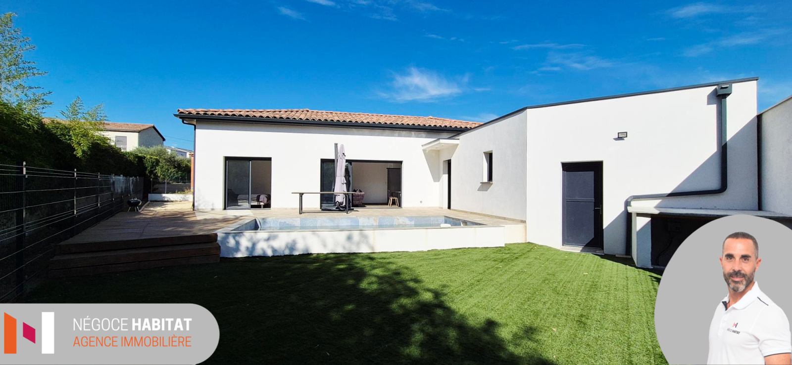ALES QUARTIER LE RIEU AU CALME / L'agence Négoce Habitat vous propose en exclusivité cette villa de plain pied T4 de 115m² estimé l'architecture contemporaine.Situé dans un quartier calme et agéable, à deux pas des commoditées. Elle se compose d'une grande pièce de vie lumineuse avec cuisine entièrement équipée, 3 chambres équipée de rangement, dont une suite parentale avec sde privative, une salle de bain commune et un WC. Cellier buanderie. Chauffage avec pompe à chaleur AIR/AIR Gainable. Garage isolé et carrelé de 25m². Coté extérieur, terrain clos et aménagé de 635m² avec terrasse et piscine 6x3 expo sud ouest sans vis à vis. Terrain de pétanque. A VOIR !! Réf FA 3864 Tarif : 350 000€ honoraire inclus soit 335 000€ net vendeur + 15000€ ttc de frais d'agence charge acquéreur soit 4.48% du tarif de vente. Tél : 04 99 77 11 25 Port : 06 14 91 07 60 www.negoce-habitat.com