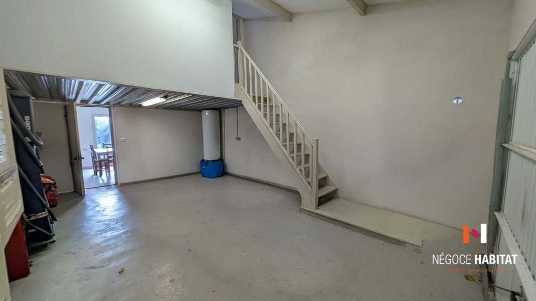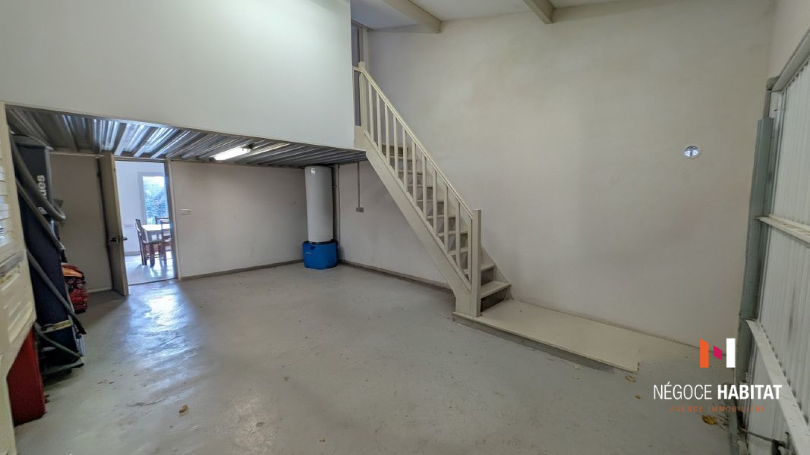 L’intérieur se compose d’une grande pièce de vie lumineuse avec une cuisine ouverte. La maison comprend quatre chambres équipées de placards, dont une située en mezzanine au‑dessus du garage, idéale pour un bureau ou un espace de télétravail. Une salle de bain et un WC séparé complètent l’ensemble.