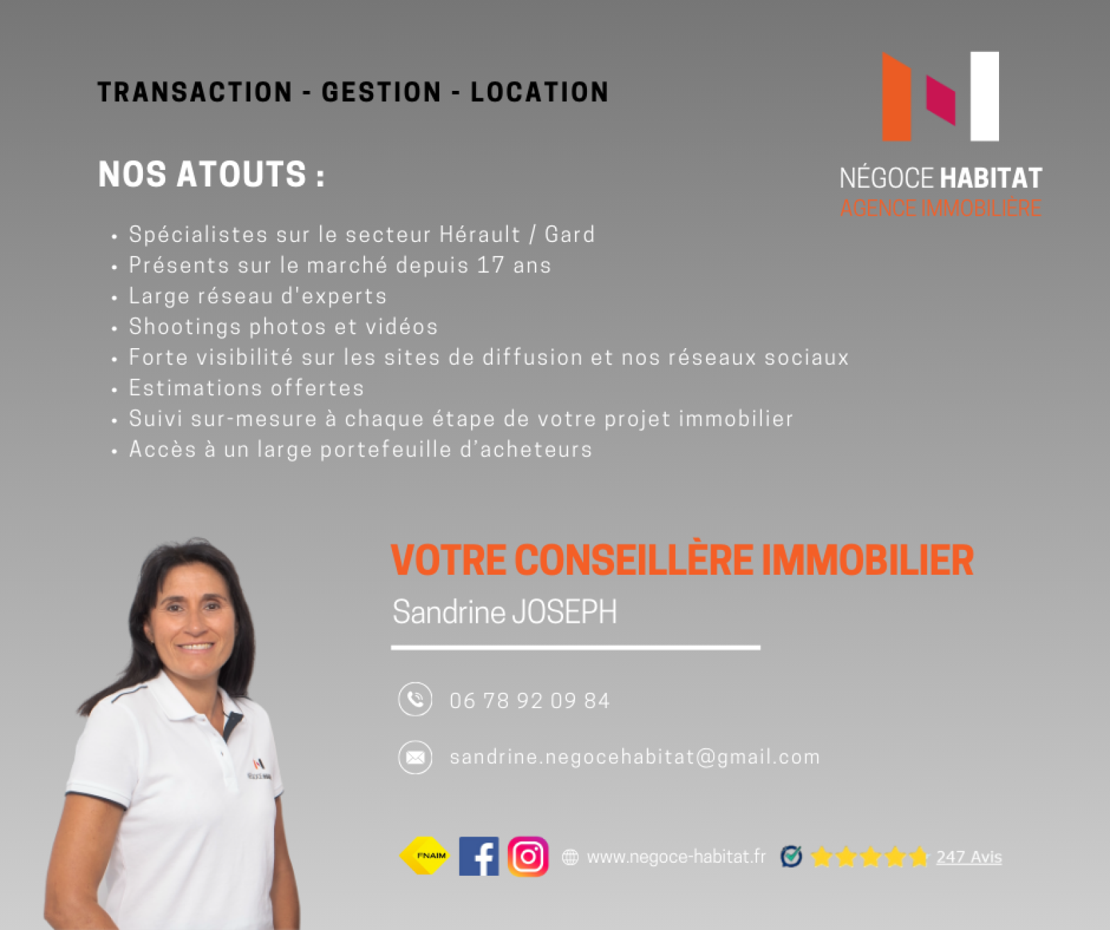 Agence immobilière NÉGOCE HABITAT, 04 99 77 11 25, 117 Av du Mas de Sapte 34130 Saint-Aunès. CPI 3402 2017 000 017 628 délivrée par la CCI de l’Hérault, SARL AFCR au capital de 5000€, www.negoce-habitat.com. Non détention de fonds. Les informations sur les risques auxquels ce bien est exposé sont disponibles sur : www.georisques.gouv.fr. Etablissement secondaire au 2 rue de l'Arnède à Sommières • 04.66.95.38.16.