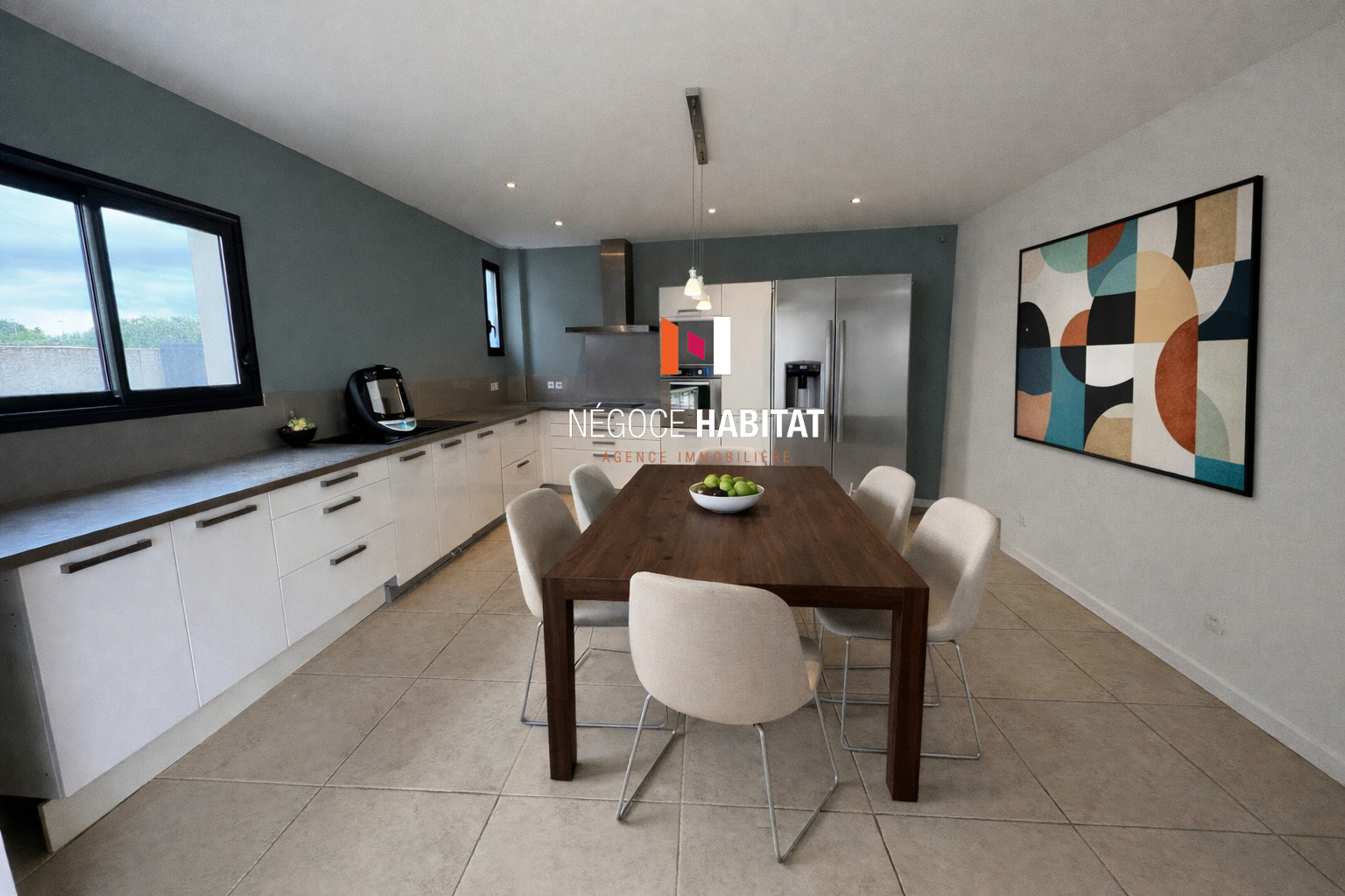 Cuisine de Chef : Un espace dînatoire entièrement équipé, optimisé par de nombreux rangements et deux grands placards coulissants, avec un accès direct à la terrasse.