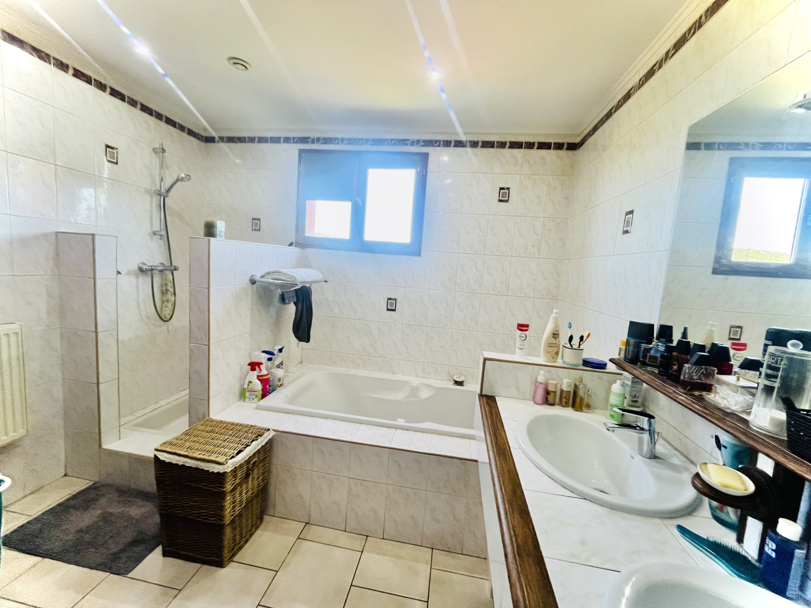 A l'étage: 3 grandes chambres, salle de bains, et une grande pièce en mezzanine pouvant être utilisée comme bureau, chambre d'amis, salle de jeux...