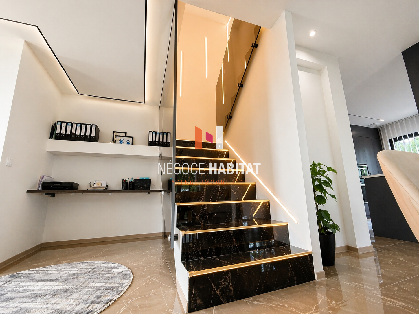 Cette maison aux lignes modernes, exposée sud-est, offre de beaux volumes et une distribution fonctionnelle.